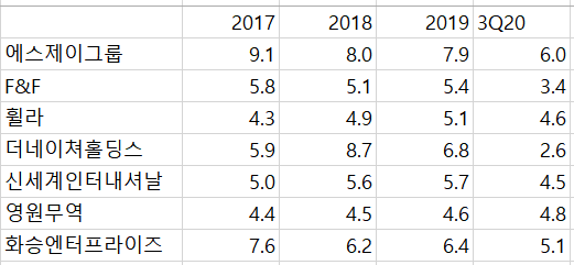 에스제이그룹이 피어 대비 재고자산 회전율이 높다. 그만큼 재고 관리를 타이트하게 하고 있는 것이다. 에스제이그룹은 F&F, 더네홀과 마찬가지로 자체 생산 설비 보유하지 않고 OEM방식으로 위탁생산하고 있다. 패션업체가 생산업체에 발주를 줄 때 해당 기간의 목표 매출액을 설정하고 그에 맞는 수량을 주문한다. 에스제이그룹은 목표 매출액이 100이라면 70 정도만 초도 발주하고, 재고 소진 상황에 따라 후속 발주를 하는 것으로 보인다. 그렇게 되면 당연히 악성 재고가 줄게 되므로 불필요한 비용이 제거된다. 이런 방식은 발주 물량이 상대적으로 작고 불규칙적이라 생산업체 측에서 불만을 가질 수 있는데 대신 생산 단가를 잘 쳐준다고 한다. 그게 판가에도 전가돼서 얘네 브랜드는 할인을 거의 실시하지 않으며 온라인과 백화점 단일 가격제를 실시해 이익률을 유지하고 있다.